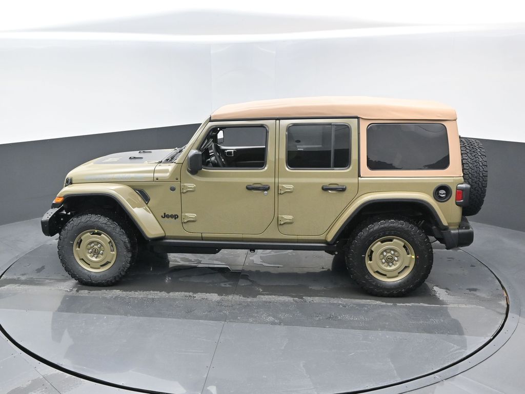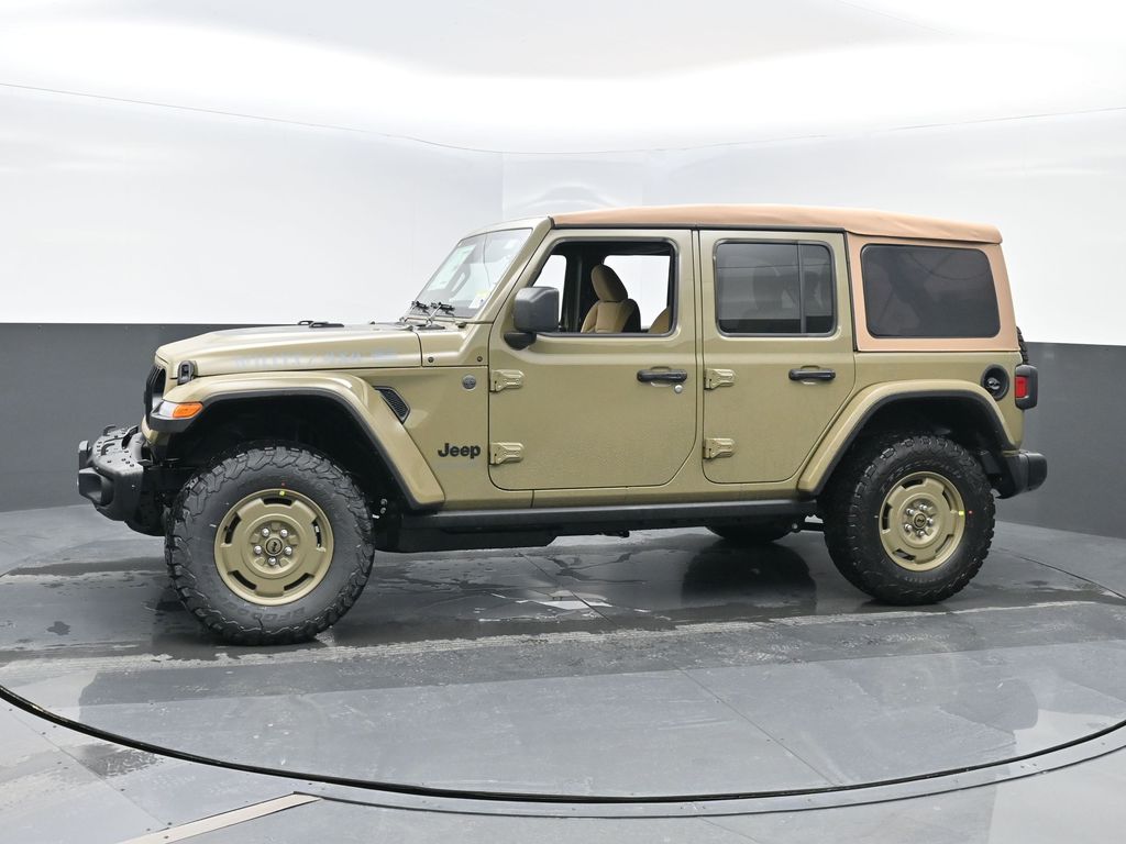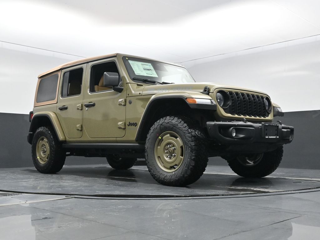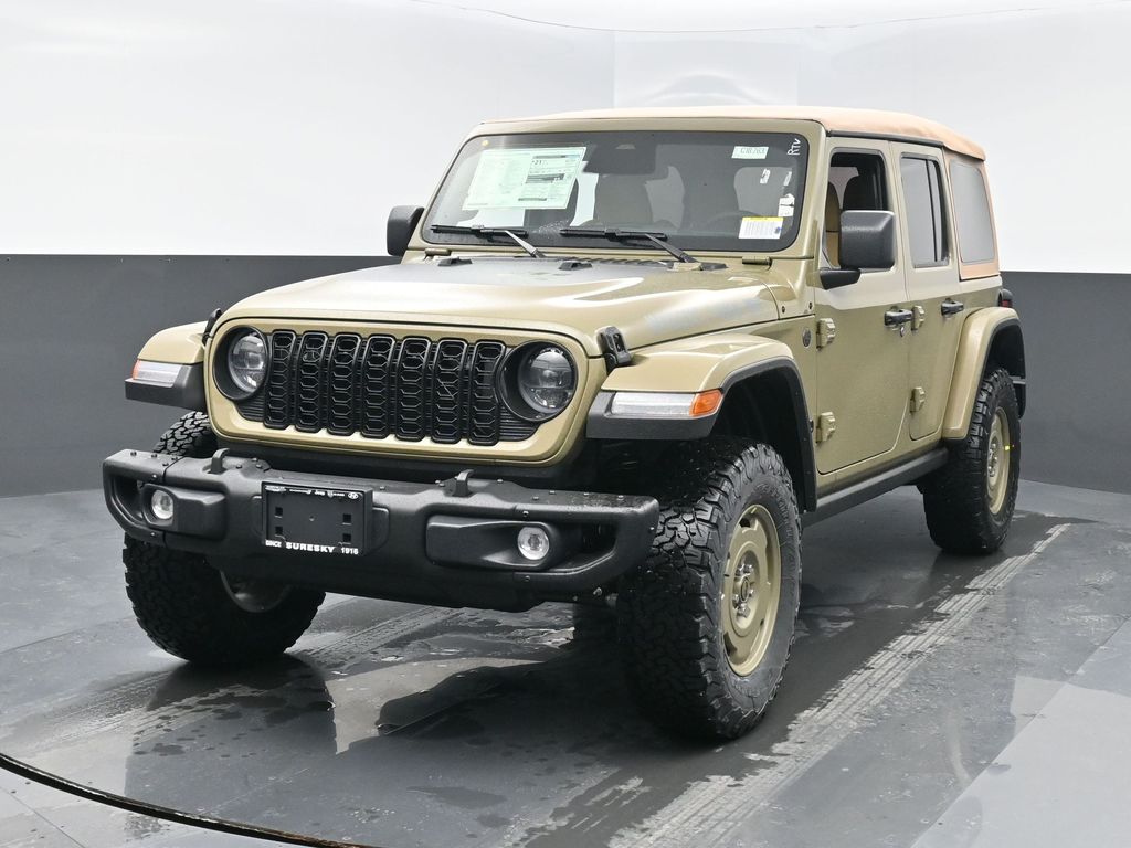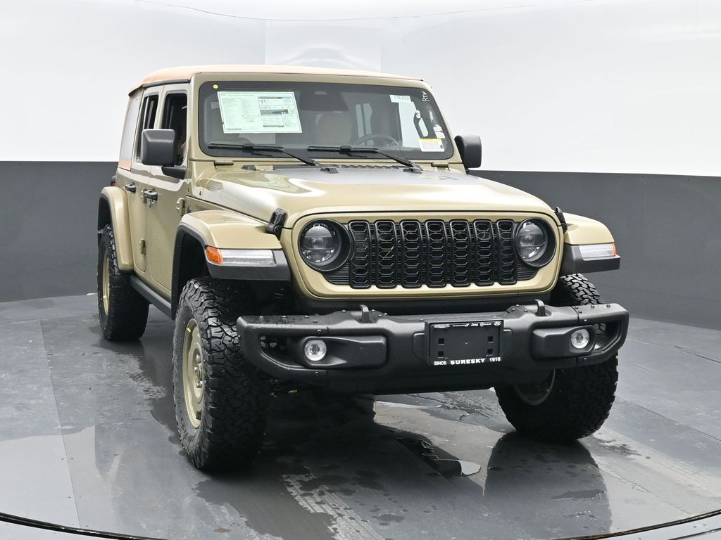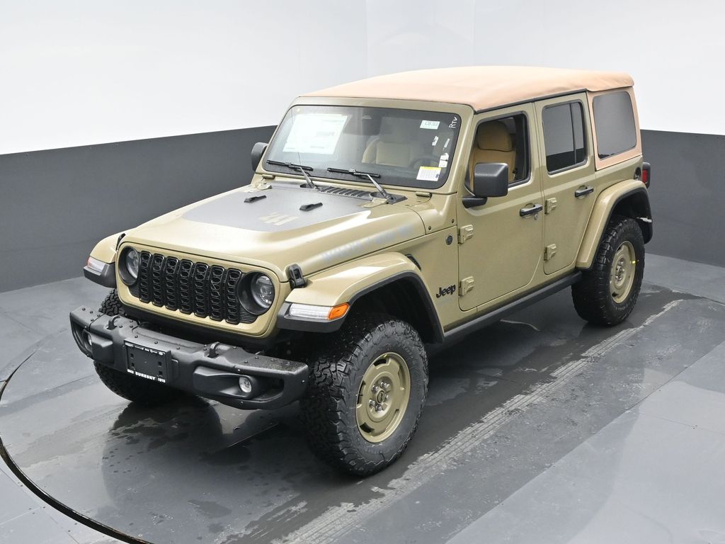 Convenience Group: Emergency/Assistance Call; 2-Door Passive Entry. Front Door Locks; Remote Start System; Cluster 7.0 TFT Color Display; Universal Garage Door Opener; Heated Front Seats; Air Conditioning W/Auto Temp Control; Heated Steering Wheel; Air Filtering. Quick Order Package 22H Willys 41: Premium Tan Sunrider Soft Top; 7 & 4 Pin Wiring Harness; Willys '41 Retro Edition Wrangler Decal; Conventional Differential Front Axle; 4WD Willys '41 Swing Gate Decal; MOPAR All-Weather Floor Mats; Dana M210 Wide HD Tube Front Axle; Body Color Grille W/Gloss Black Rings; Daytime Running Lamps LED Accents; Front LED Fog Lamps; LED Premium Reflector Headlamps; E-Locker Rear Axle; Body Color Rubicon Highline Flare; Corning Gorilla Glass; Security Alarm; 4.10 Rear Axle Ratio; Willys '41 Retro Edition Tailgate Plaque; Willys '41 Retro Shift Bezel Insert; 5. 675 lbs GVWR; Class II Receiver Hitch; Steel Front Bumper; 17 X 7.5 Fully Painted Wheels; Advanced Brake Assist; Willy's Suspension; Automatic Headlamps; Willys '41 Retro Edition Hood Decal; Deep Tint Sunscreen Windows; Off-Road Plus Mode; Willys '41 US Edition U.S. Hood Decal; Full Speed Forward Collision Warning Plus; Rock Protection Sill Rails; Willys '41 Retro Edition Buzz Model; 97 MPH Vehicle Max Speed Calibration; Cloth Low-Back Bucket Seats; Power Heated Mirrors; Auxiliary Switches; Adaptive Cruise Control W/Stop; Dana M220 Wide Rear Axle; Premium Wrapped Steering Wheel; LT285/70R17C BSW Off-Road Tires; Sun Visors W/Illuminated Vanity Mirrors; Steel Rear Bumper. Steel Power Dome Hood Package (DISC): Power Dome Dual Vented Hood. Quick Order Package 24H Willys 41: Premium Tan Sunrider Soft Top; 7 & 4 Pin Wiring Harness; Willys '41 Retro Edition Wrangler Decal; Conventional Differential Front Axle; 4WD Willys '41 Swing Gate Decal; MOPAR All-Weather Floor Mats; Dana M210 Wide HD Tube Front Axle; Body Color Grille W/Gloss Black Rings; Daytime Running Lamps LED Accents; Front LED Fog Lamps; LED Premium Reflector Headlamps; E-Locker Rear Axle; Body Color Rubicon Highline Flare; Corning Gorilla Glass; Security Alarm; 4.10 Rear Axle Ratio; Willys '41 Retro Edition Tailgate Plaque; Willys '41 Retro Shift Bezel Insert; 5. 675 lbs GVWR; Class II Receiver Hitch; Steel Front Bumper; 17 X 7.5 Fully Painted Wheels; Advanced Brake Assist; Willy's Suspension; Automatic Headlamps; Willys '41 Retro Edition Hood Decal; Deep Tint Sunscreen Windows; Off-Road Plus Mode; Willys '41 US Edition U.S. Hood Decal; Full Speed Forward Collision Warning Plus; Rock Protection Sill Rails; Willys '41 Retro Edition Buzz Model; 97 MPH Vehicle Max Speed Calibration; Cloth Low-Back Bucket Seats; Power Heated Mirrors; Auxiliary Switches; Adaptive Cruise Control W/Stop; Dana M220 Wide Rear Axle; Premium Wrapped Steering Wheel; LT285/70R17C BSW Off-Road Tires; Sun Visors W/Illuminated Vanity Mirrors; Steel Rear Bumper. 41. **Equipment listed is based on original vehicle build and subject to change. Please confirm the accuracy of the included equipment by calling the dealer prior to purchase.**