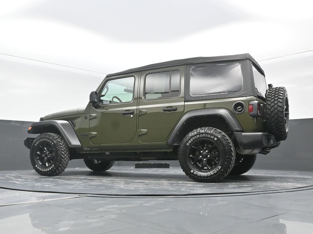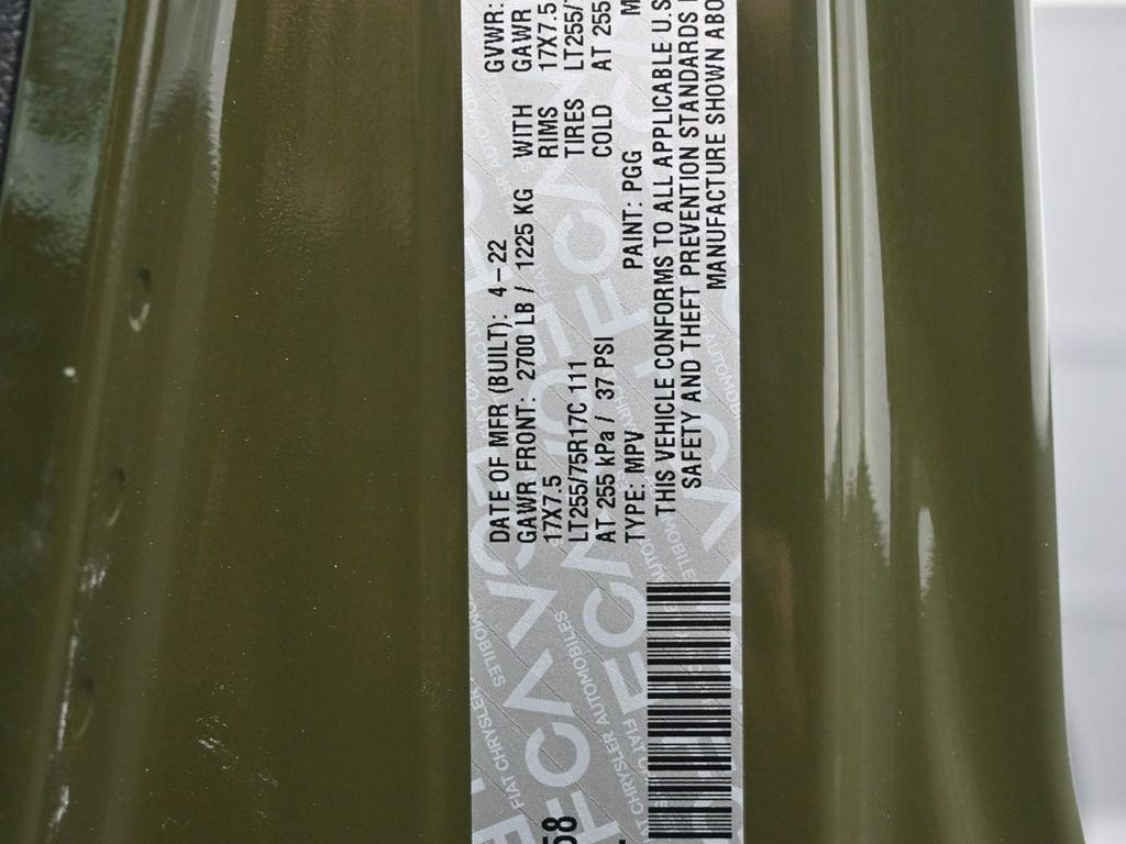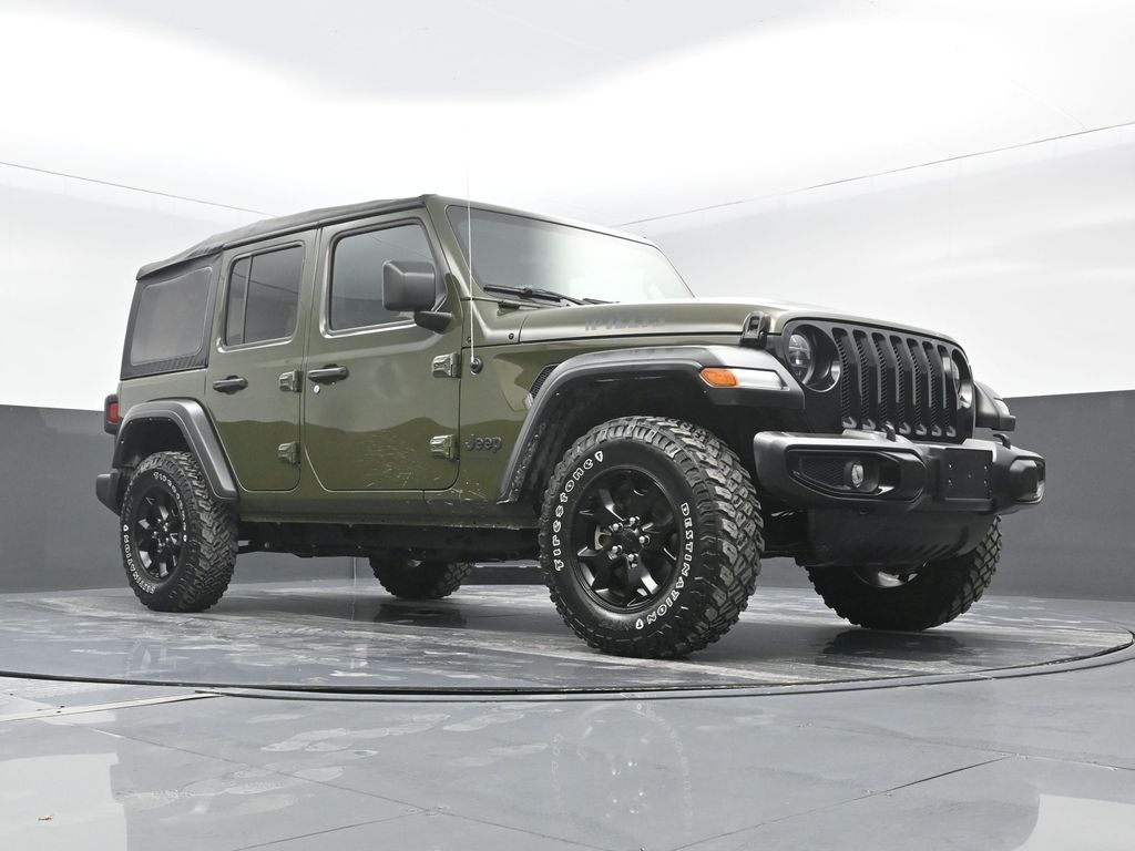 Cold Weather Group: Remote Start System; Heated Front Seats; Leather Wrapped Steering Wheel; Heated Steering Wheel. Convenience Group: Remote Start System; Universal Garage Door Opener. Quick Order Package 24W Willys: Willys; Mold in Color Bumper with Gloss Black; Speed Sensitive Power Locks; Automatic Headlamps; Leather Wrapped Steering Wheel; Deep Tint Sunscreen Windows; Black Trail Rated Badge; 4-Wheel Drive Swing Gate Decal; Black Grille; MOPAR All-Weather Floor Mats; Willys Hood Decal; Rock Protection Sill Rails; LT255/75R17C Tires; Front 1-Touch Down Power Windows; 97 MPH Vehicle Max Speed Calibration; Anti-Spin Differential Rear Axle; Power Heated Mirrors; Matte Black Jeep Badge; Security Alarm; 17 X 7.5 Moab Black Aluminum Wheels; Remote Keyless Entry; Sun Visors with Illuminated Vanity Mirrors. LED Headlamp and Fog Lamp Group: Front LED Fog Lamps; LED Premium Reflector Headlamps. Quick Order Package 23W Willys: Willys; Mold in Color Bumper with Gloss Black; Speed Sensitive Power Locks; Automatic Headlamps; Leather Wrapped Steering Wheel; Deep Tint Sunscreen Windows; Black Trail Rated Badge; 4-Wheel Drive Swing Gate Decal; Black Grille; MOPAR All-Weather Floor Mats; Willys Hood Decal; Rock Protection Sill Rails; LT255/75R17C Tires; Front 1-Touch Down Power Windows; 97 MPH Vehicle Max Speed Calibration; Anti-Spin Differential Rear Axle; Power Heated Mirrors; Matte Black Jeep Badge; Security Alarm; 17 X 7.5 Moab Black Aluminum Wheels; Remote Keyless Entry; Sun Visors with Illuminated Vanity Mirrors. Sarge Green Clearcoat. Sarge Green Clearcoat. **Equipment listed is based on original vehicle build and subject to change. Please confirm the accuracy of the included equipment by calling the dealer prior to purchase.**