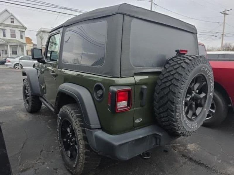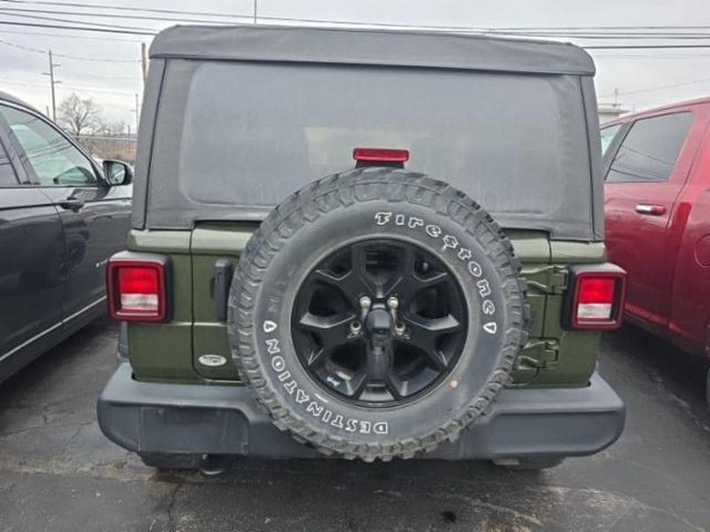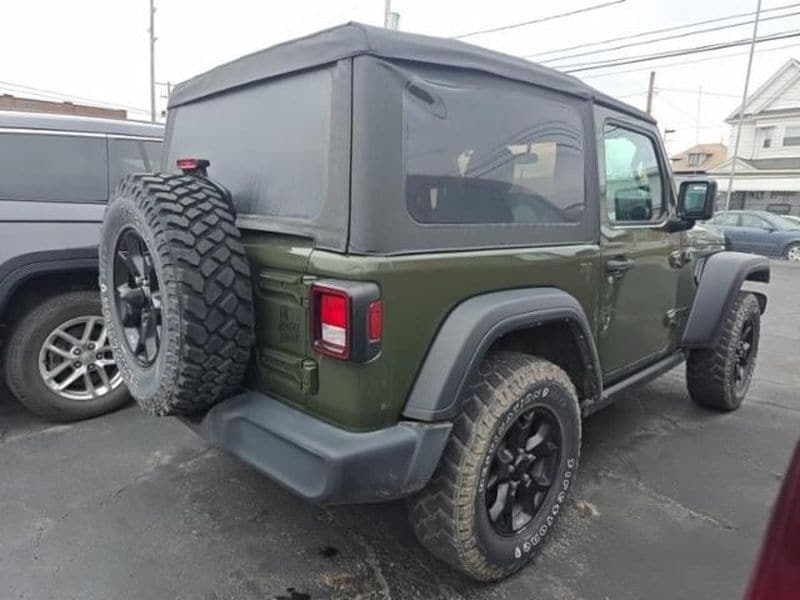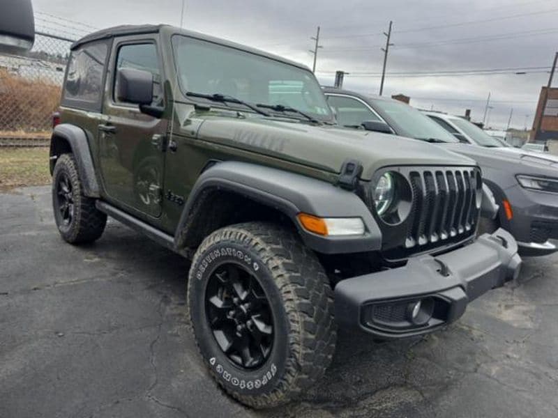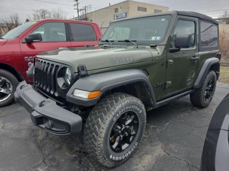 Cold Weather Group: Remote Start System; Heated Front Seats; Leather Wrapped Steering Wheel; Heated Steering Wheel Convenience Group: Remote Start System; Universal Garage Door Opener Quick Order Package 22W Willys: USB Host Flip; Speed Sensitive Power Locks; Leather Wrapped Steering Wheel; Integrated Voice Command with Bluetooth; 4-Wheel Drive Swing Gate Decal; Black Grille; MOPAR All-Weather Floor Mats; GPS Antenna Input; LT255/75R17C Tires; Front 1-Touch Down Power Windows; Anti-Spin Differential Rear Axle; Global Telematics Box Module; Security Alarm; 17 X 7.5 Moab Black Aluminum Wheels; Willys; Mold in Color Bumper with Gloss Black; Automatic Headlamps; Air Conditioning; Deep Tint Sunscreen Windows; Black Trail Rated Badge; SiriusXM Guardian-Included Trial (B); Willys Hood Decal; Rock Protection Sill Rails; 97 MPH Vehicle Max Speed Calibration; Power Heated Mirrors; Matte Black Jeep Badge; Bridgestone Brand Tires; Remote Keyless Entry; Sun Visors with Illuminated Vanity Mirrors LED Headlamp and Fog Lamp Group: Front LED Fog Lamps; LED Premium Reflector Headlamps Quick Order Package 23W Willys: USB Host Flip; Speed Sensitive Power Locks; Leather Wrapped Steering Wheel; Integrated Voice Command with Bluetooth; 4-Wheel Drive Swing Gate Decal; Black Grille; MOPAR All-Weather Floor Mats; GPS Antenna Input; LT255/75R17C Tires; Front 1-Touch Down Power Windows; Anti-Spin Differential Rear Axle; Global Telematics Box Module; Security Alarm; 17 X 7.5 Moab Black Aluminum Wheels; Willys; Mold in Color Bumper with Gloss Black; Automatic Headlamps; Air Conditioning; Deep Tint Sunscreen Windows; Black Trail Rated Badge; SiriusXM Guardian-Included Trial (B); Willys Hood Decal; Rock Protection Sill Rails; 97 MPH Vehicle Max Speed Calibration; Power Heated Mirrors; Matte Black Jeep Badge; Bridgestone Brand Tires; Remote Keyless Entry; Sun Visors with Illuminated Vanity Mirrors Sarge Green Clearcoat SiriusXM Satellite Radio Corning Gorilla Glass **Equipment listed is based on original vehicle build and subject to change. Please confirm the accuracy of the included equipment by calling the dealer prior to purchase.**