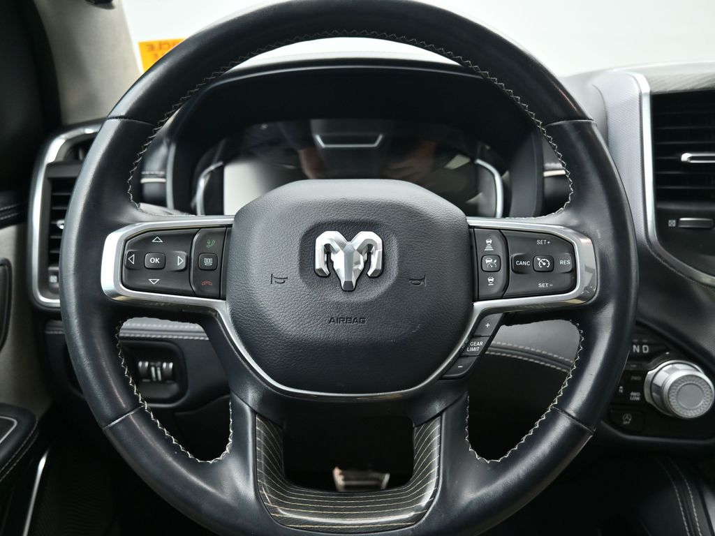This unit has a premium sound system installed. Lane Keep Assist in the Ram 1500 helps maintain safe driving by gently steering to stay within the lane. Keep your hands warm all winter with a heated steering wheel in this vehicle . You'll never again be lost in a crowded city or a country region with the navigation system on this Ram 1500. The leather seats in this model are a must for buyers looking for comfort, durability, and style. This unit has automated speed control that adjusts to maintain a safe following distance, enhancing highway driving convenience. The Ram 1500's Forward Collision Warning feature alerts drivers to potential front-end collisions. See what's behind you with the back up camera on this model. The vehicle offers Apple CarPlay for seamless connectivity. The vehicle features a hands-free Bluetooth phone system. Never get into a cold vehicle again with the remote start feature on this 1/2 ton pickup.